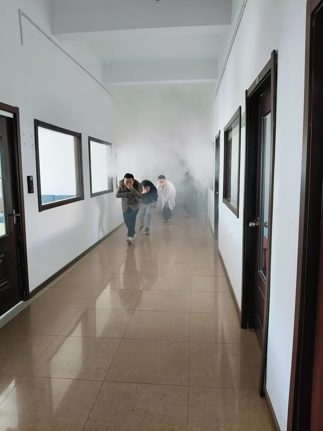 三、進(jìn)行消防演習(xí) 1、逃生 模擬辦公區(qū)域著火,辦公室人員遇火災(zāi)如何快速逃生。
