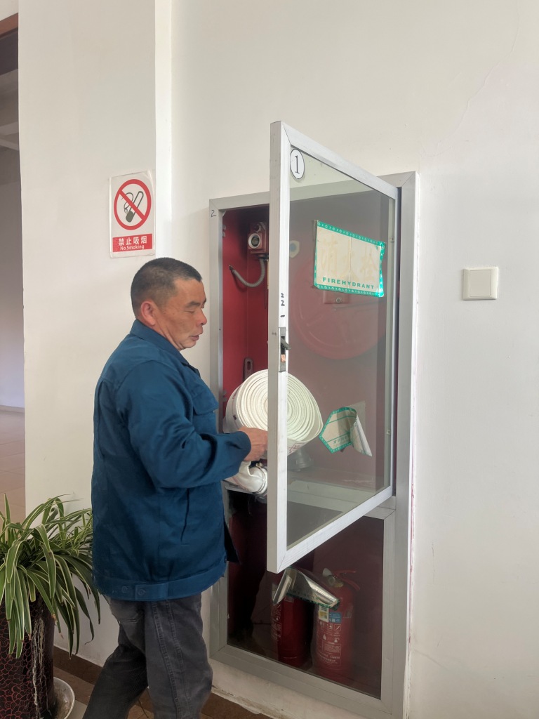 火災(zāi)逃生要點(diǎn):保持冷靜、盡快報(bào)警、低姿前行、封閉房門、尋找逃生通道、切勿乘坐電梯、互幫互助和注意安全。 2、消防栓的使用 劉順講解消防栓的使用: 1)打開消防栓箱,按下內(nèi)部火警按鈕。 2)取出消防水帶,向著火源點(diǎn)延伸展開,注意避免扭折水帶。 3)接上水槍,將水帶的一端與水槍連接,另一端接口與消火栓接口連接。 4)連接水源,確保連接扣準(zhǔn)確插入滑槽,按順時(shí)針方向擰緊。 5)手握水槍頭及水管,打開水閥門,即可滅火。